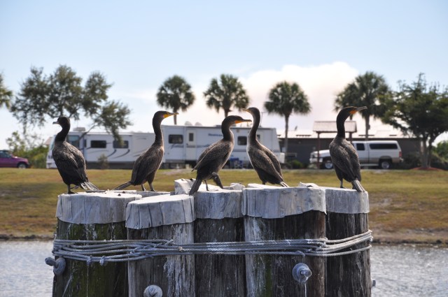 A gulp of double-crested cormorants assess the captain's skills as we enter the lock.