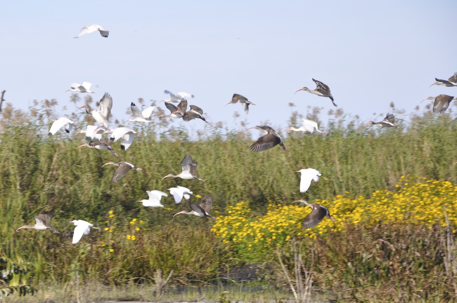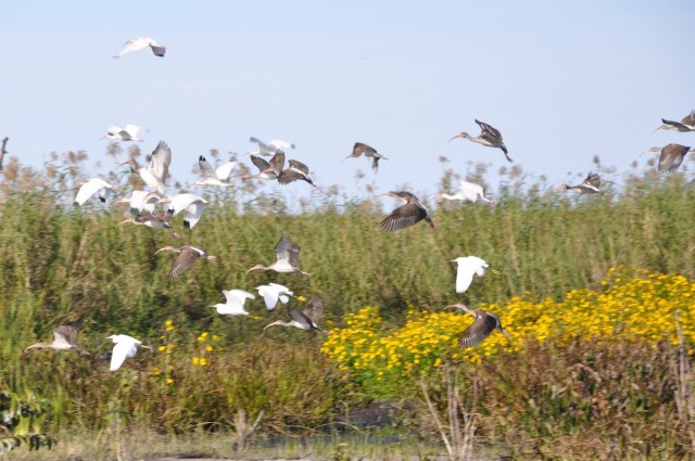 White ibis (with immatures) and snowy egrets take flight as "Arkansas Traveler" passes.