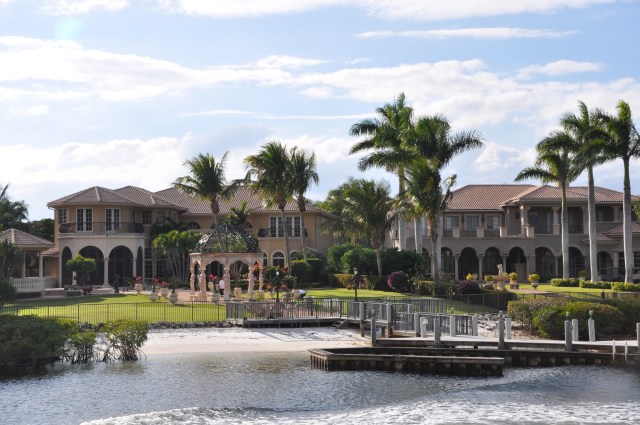 The homes were lavish with individual architectural styles and lush landscaping.  The tropical plants and trees provided endless pleasure as we transited the waterway.  Homeowners focused on aesthetics facing the water.  Large windows, patio spaces, manicured lawns, large flowering splashes of color, and facing terraces all spoke of welcoming havens to relax and visit.