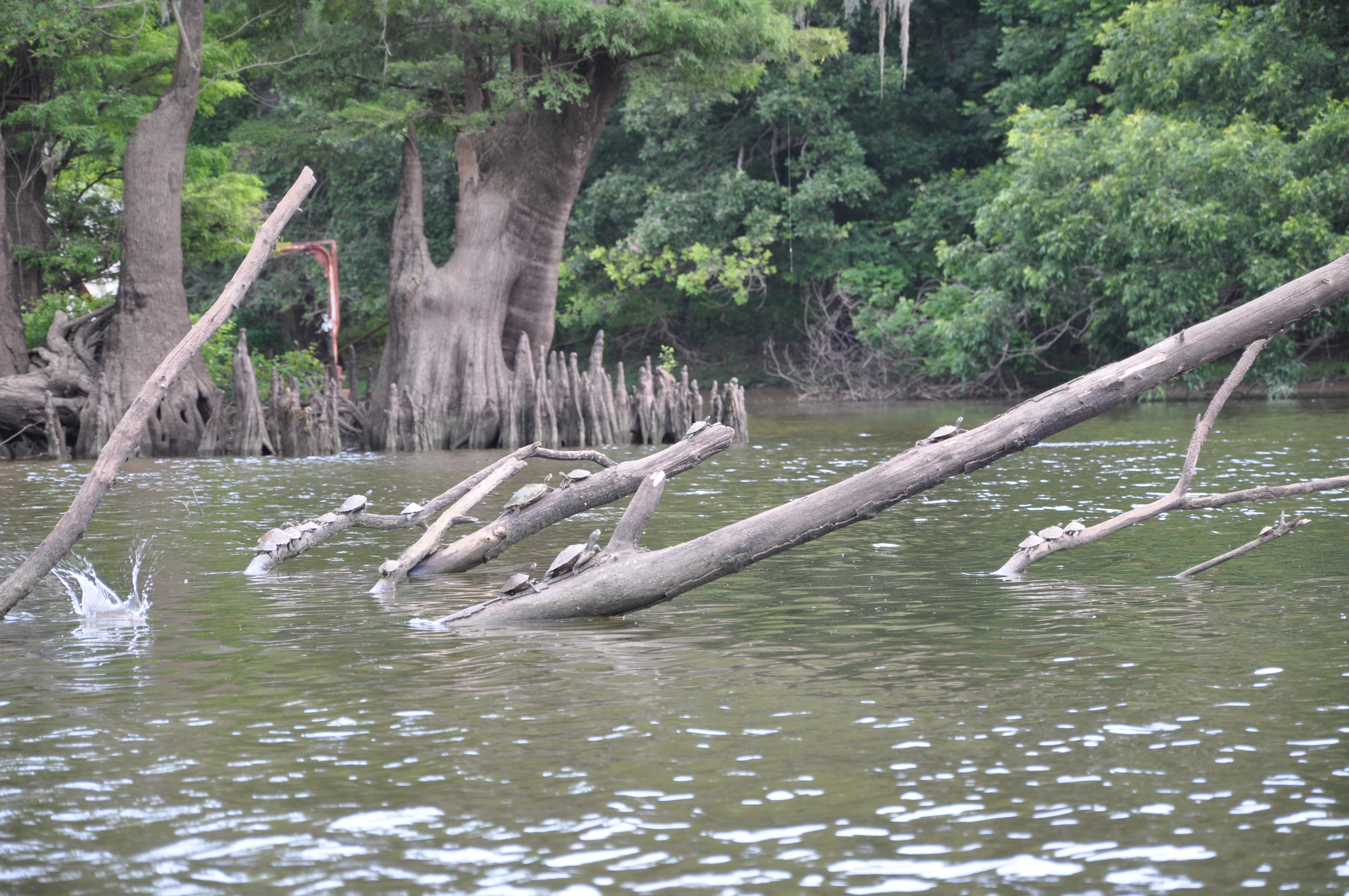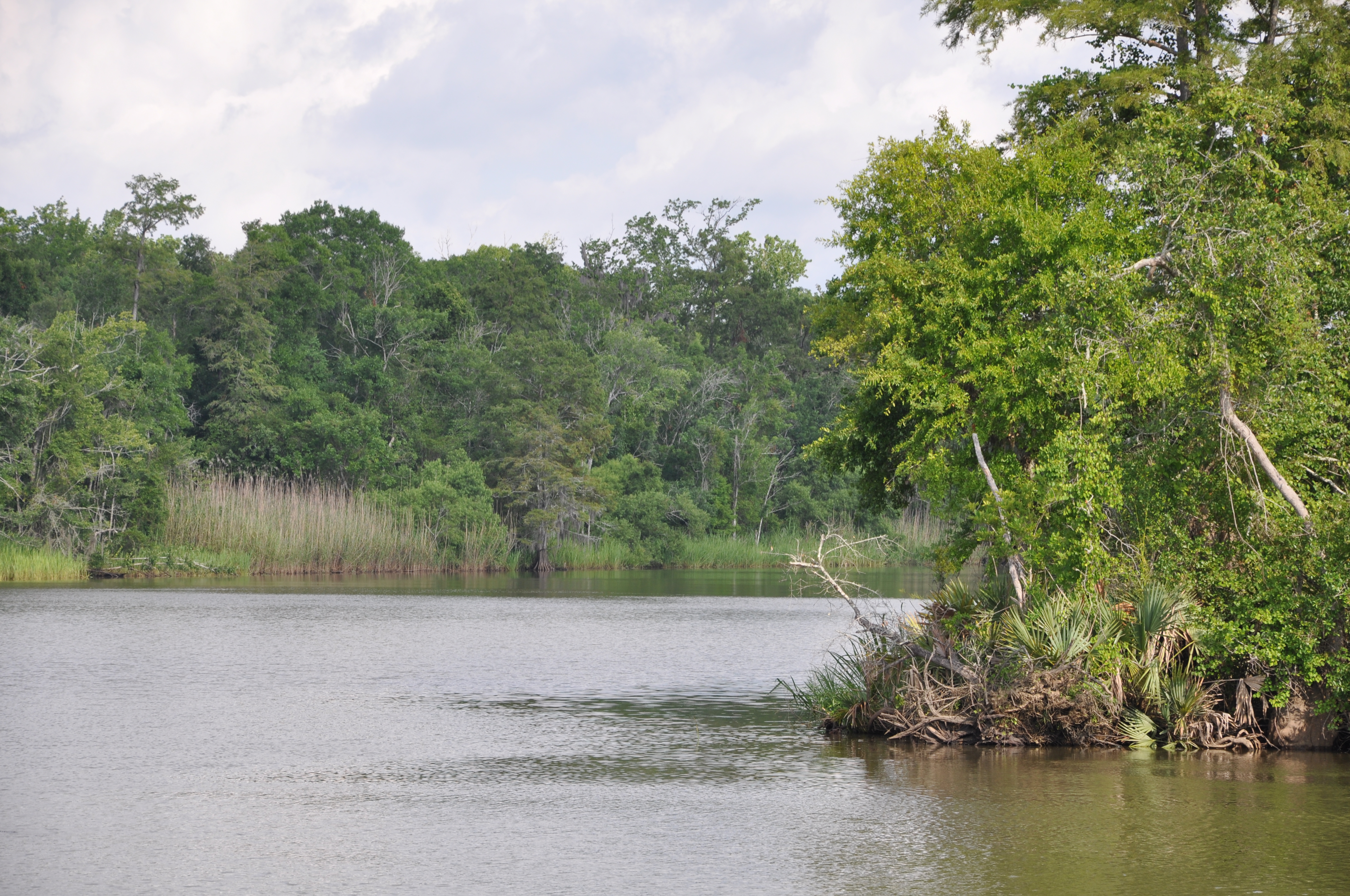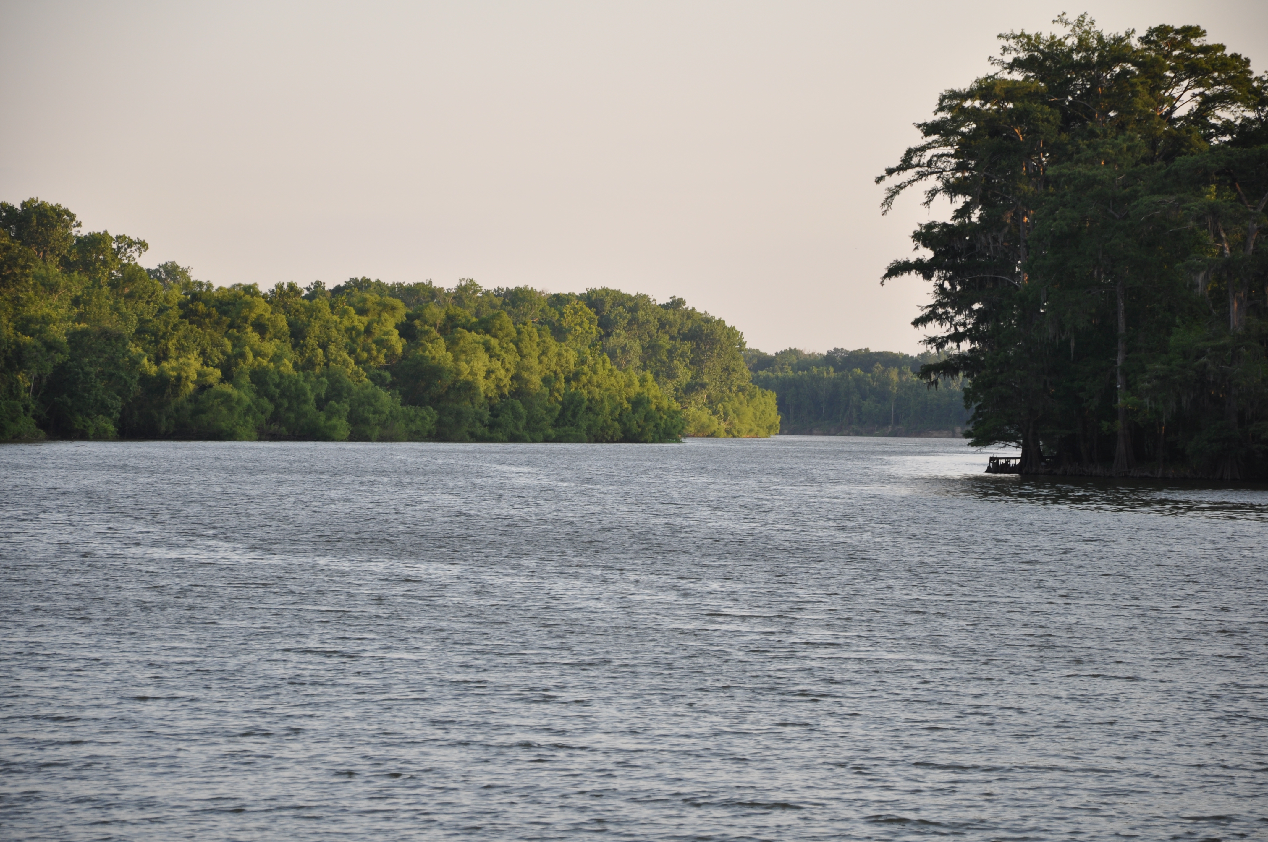 We were below the first lock at Coffeeville, and were in tidal waters which necessitated using two anchors in most spots to avoid being drawn into shallows by the current. As evening approached we realized that we would not reach Coffeeville by dark and decided to slip into Bates Lake for the night.