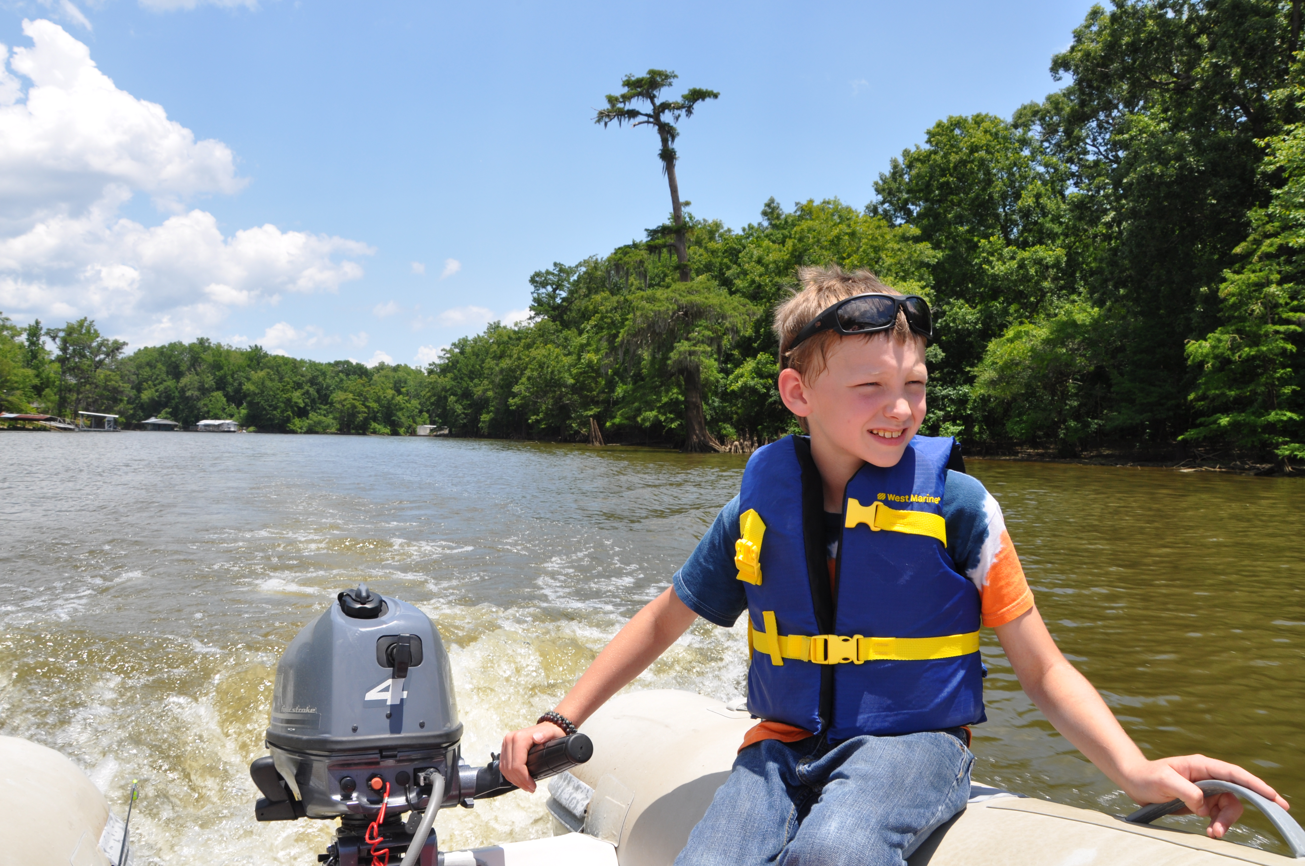 The quandary would come the following day when the tide was low. But, being smart and invincible, I just knew that it would work itself out. Tides, however, have their own pace and their own schedule and the tide was, of course, dead low in the morning. Being resourceful, we decided to make it a play-day there in the lake. Cody learned to drive the dinghy and we spent our time exploring and fishing.