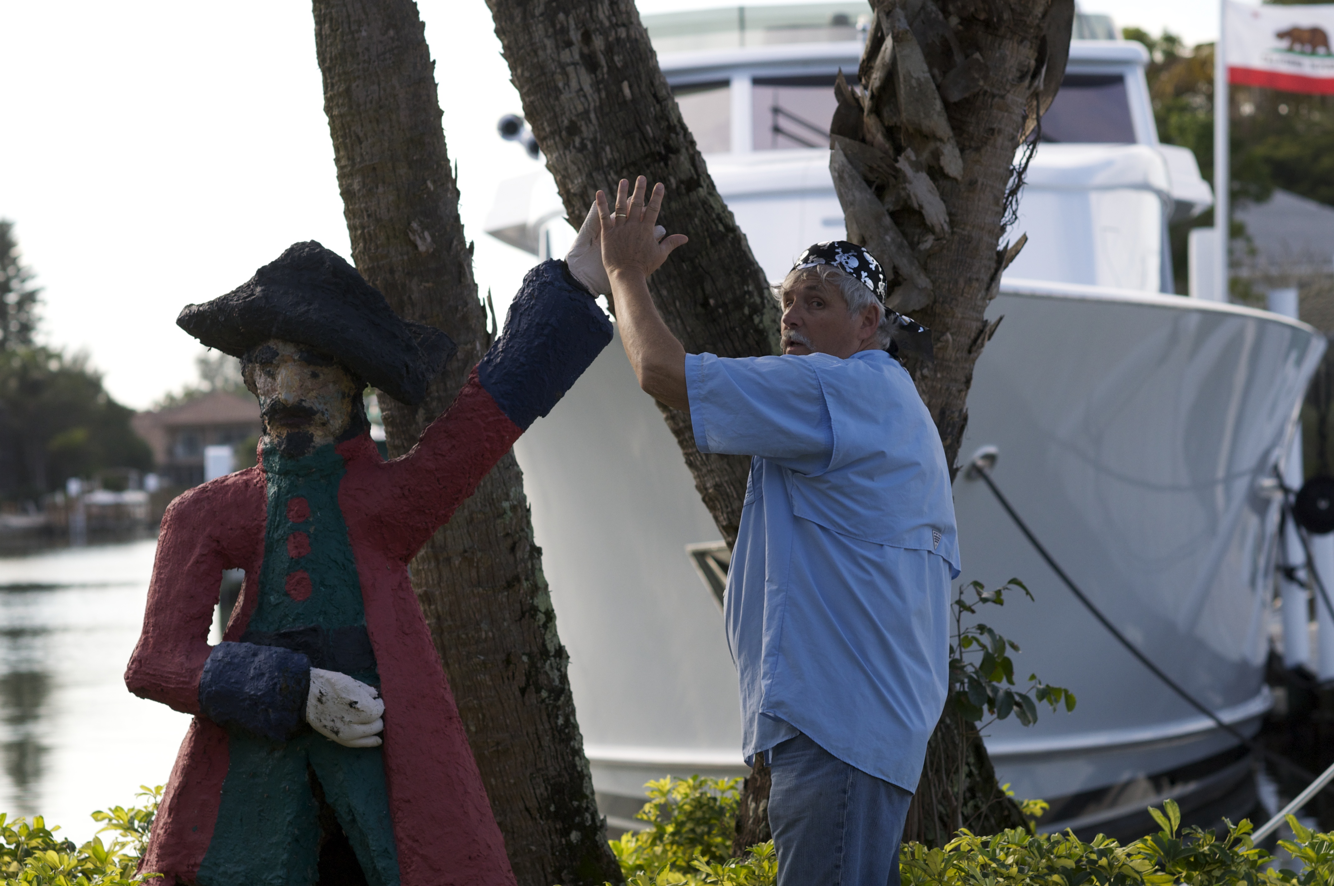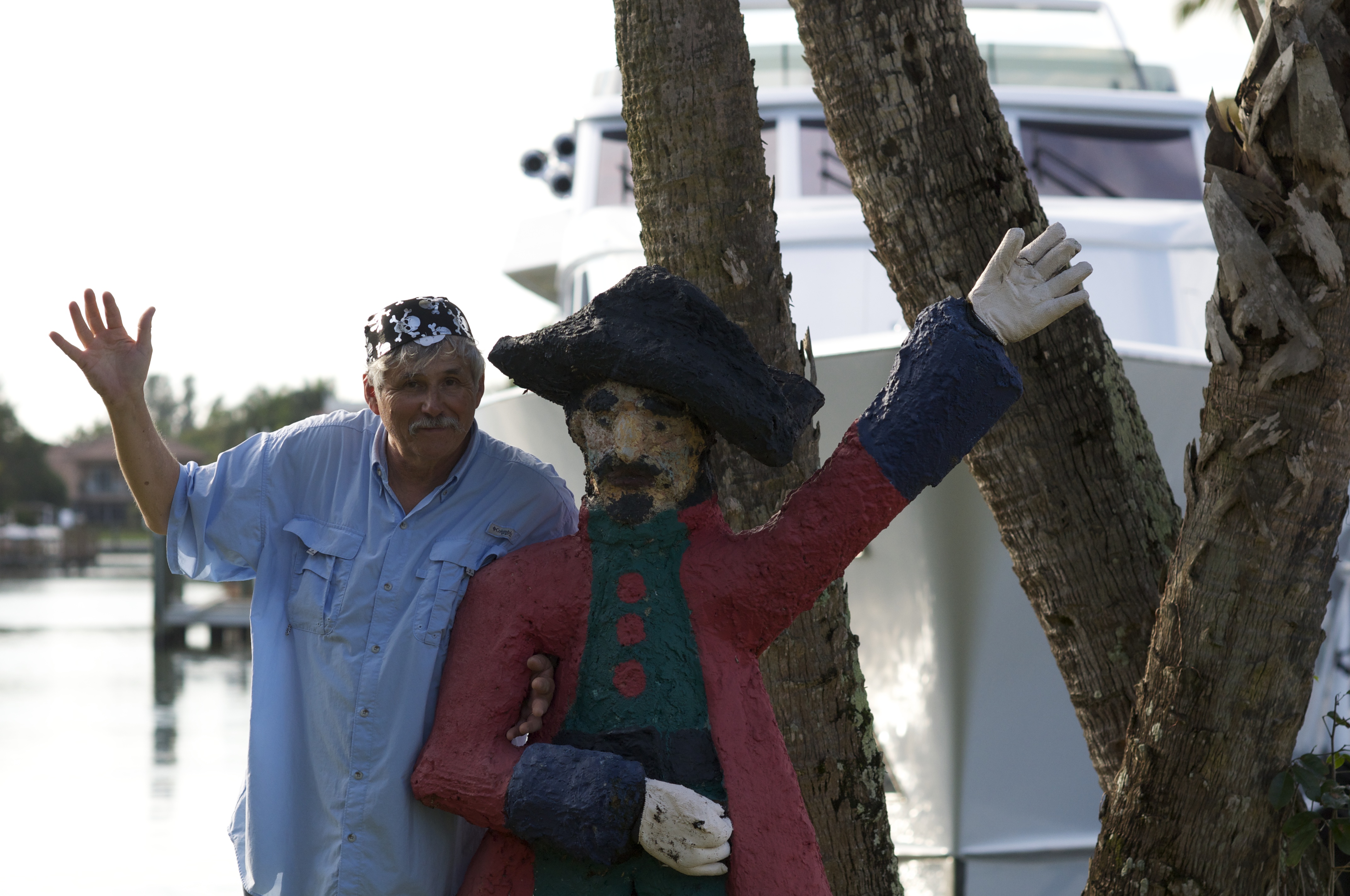 David and I take an extended dinghy ride that I never want to return from – the temps are in the low 80s and a sweet breeze keeps me from getting too warm. It is just perfect here. Coolish at night and warmish during the day. Sea birds and sea critters abound. There’s lots of shells to look at and things move a bit slower on the island. I can not believe that after slogging 1075 miles through the cold to get here we are leaving with only ½ day of paradise under our belts. Poor Bob missed the dinghy ride because he insisted on defrosting the fridge. Such is the life of responsible adults but he made up for it when he discovered a fellow-pirate.