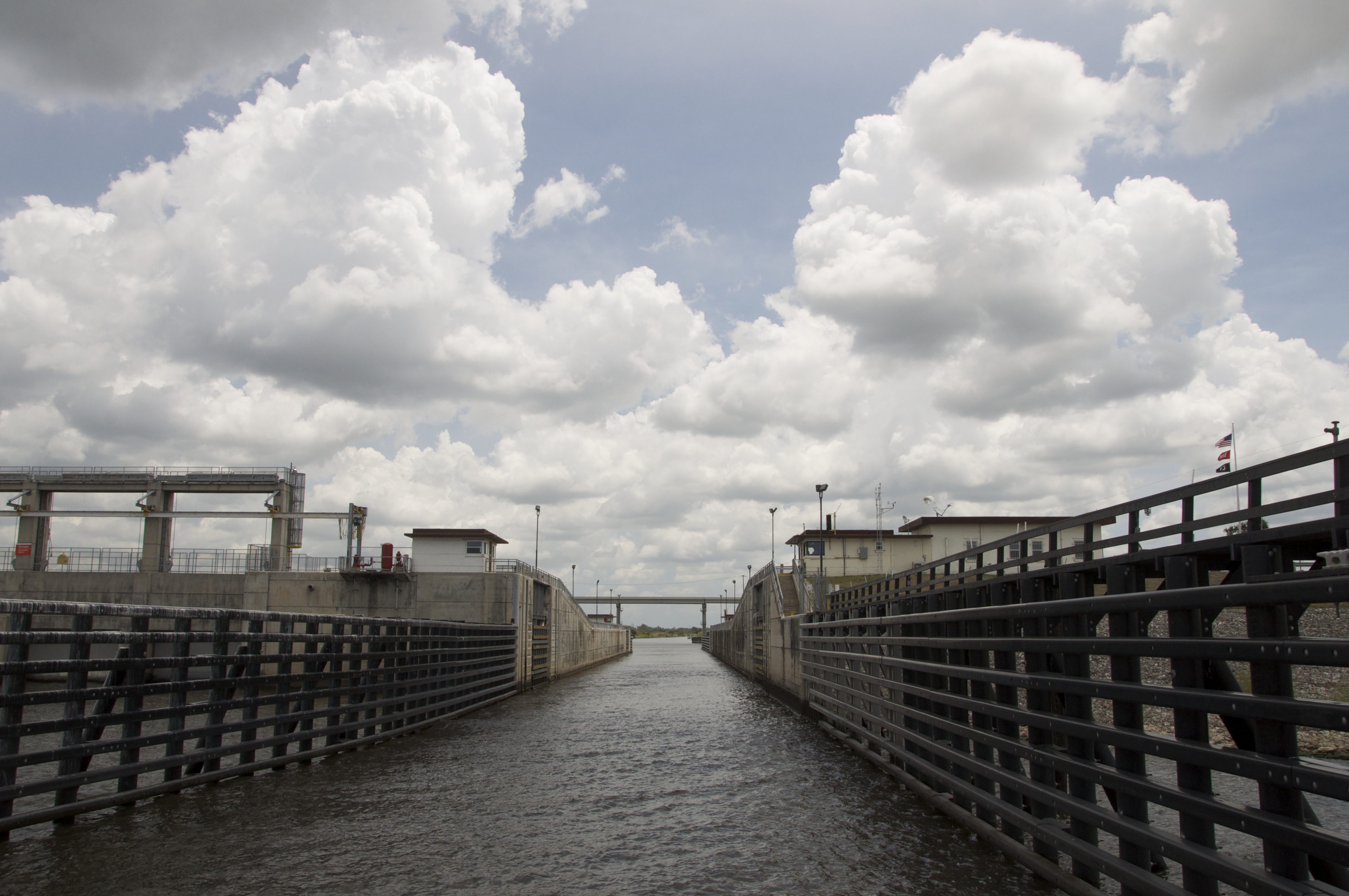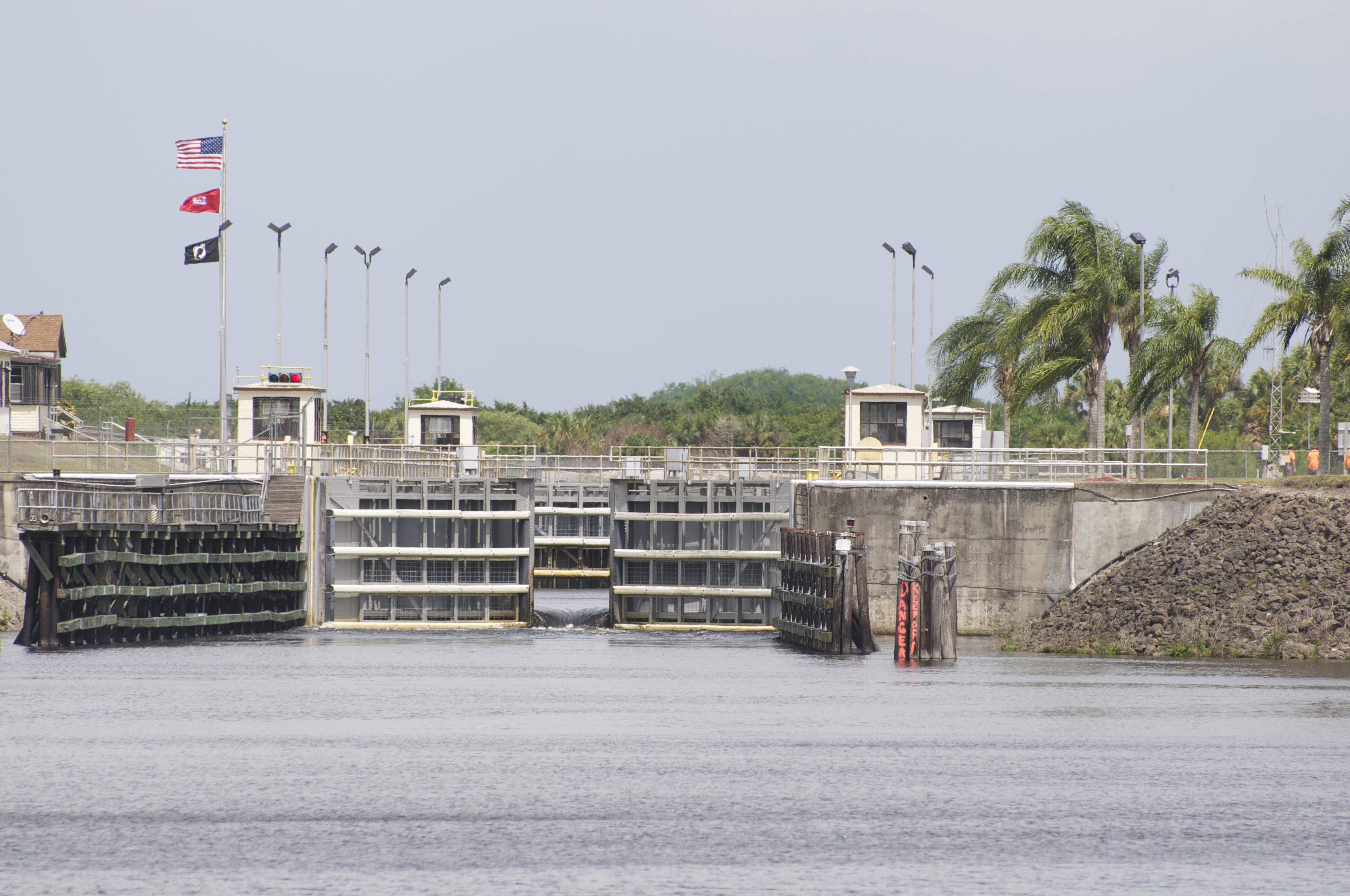 Rather than let the water in and out of the lock by an underwater chute, the Okeechobee locks just open the main gate.