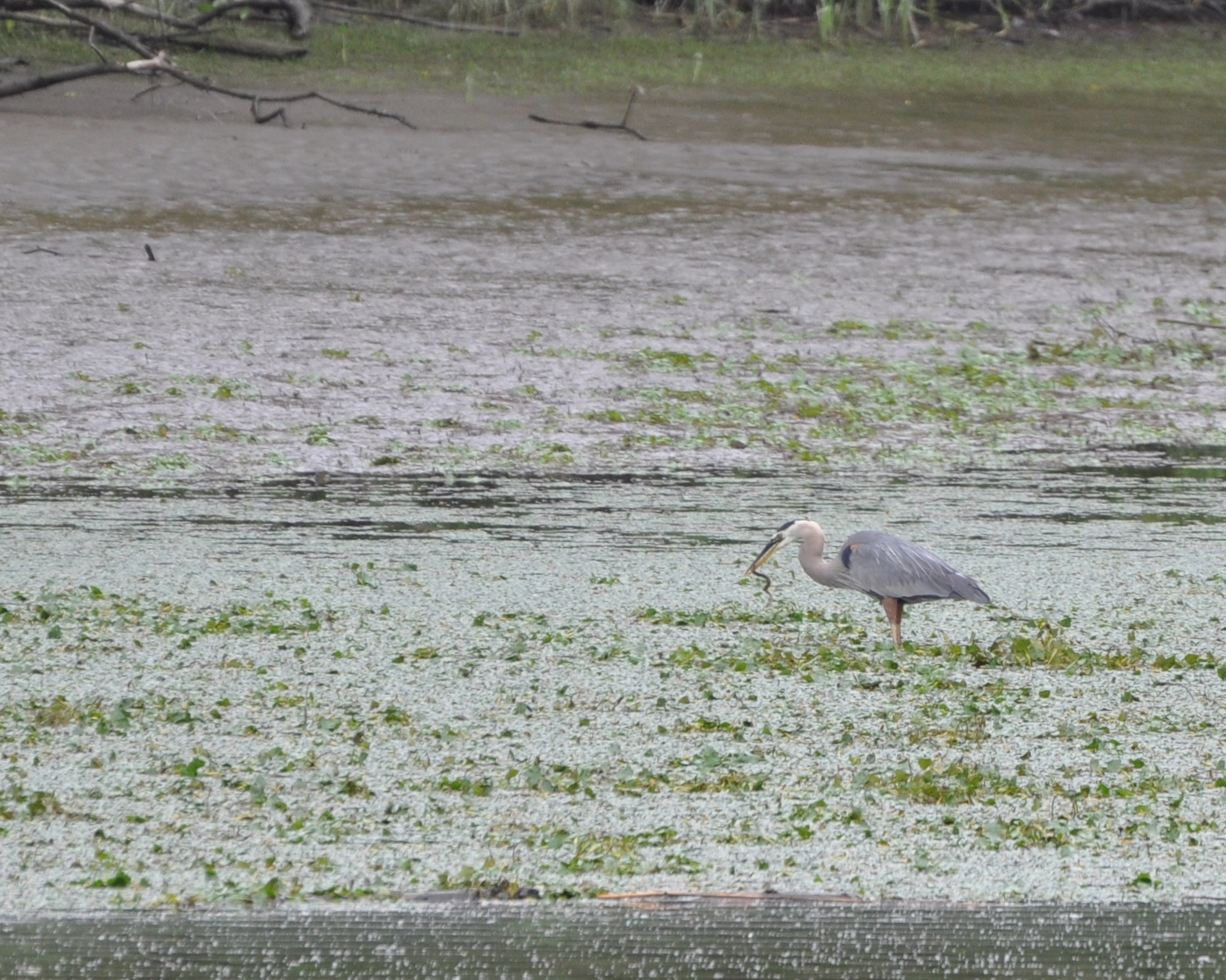 A Great Blue Heron grabbing a wriggling meal at the creek's edge.